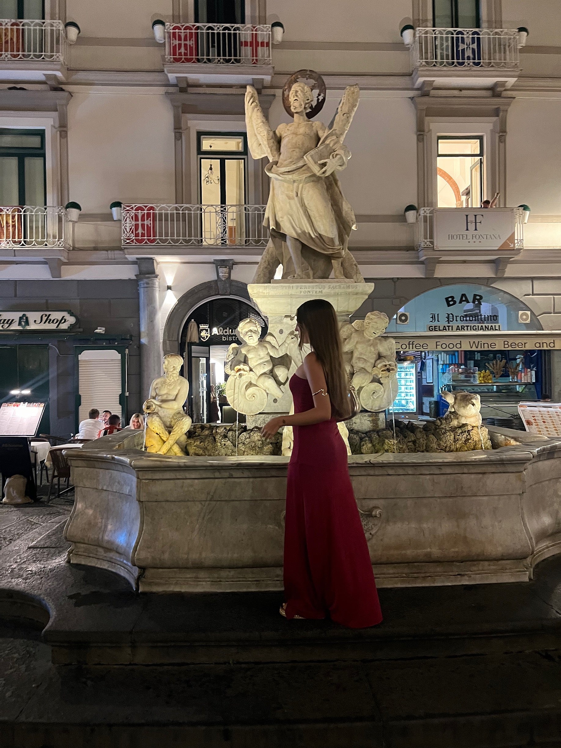 Strapless maxi dress in burgundy stretch fabric. The dress is elasticated and double lined at the top with an asymmetrical seam connecting the bottom panel. This dress has a slit on the one side.