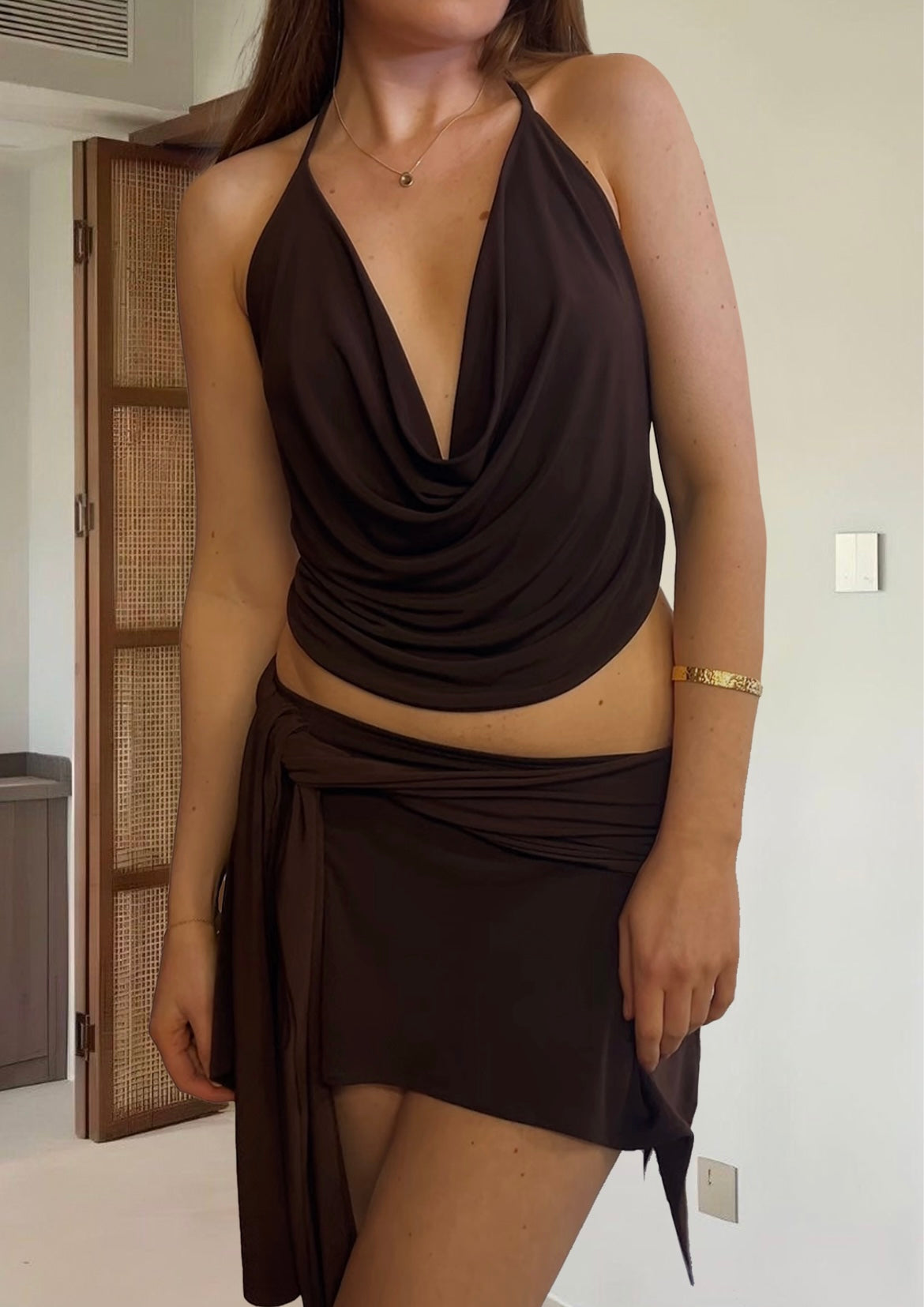 The Aruba Top is a wardrobe essential for nights out or resort escapes. This cowl neck top features a draped neckline, daring open back, and tie-up detail for the perfect fit.The top is double lined.