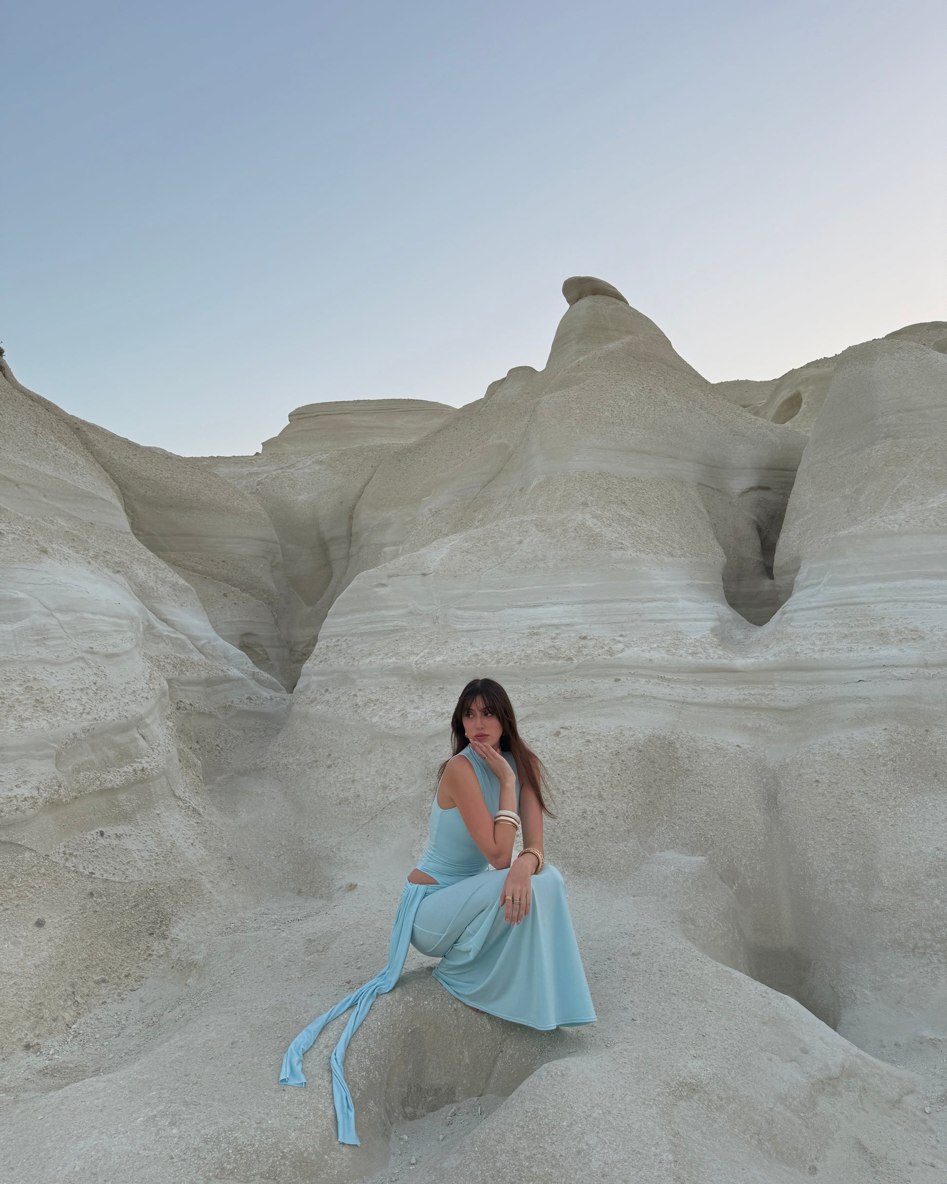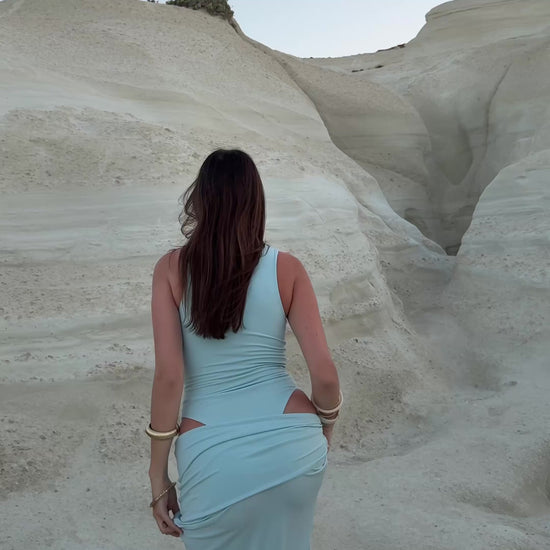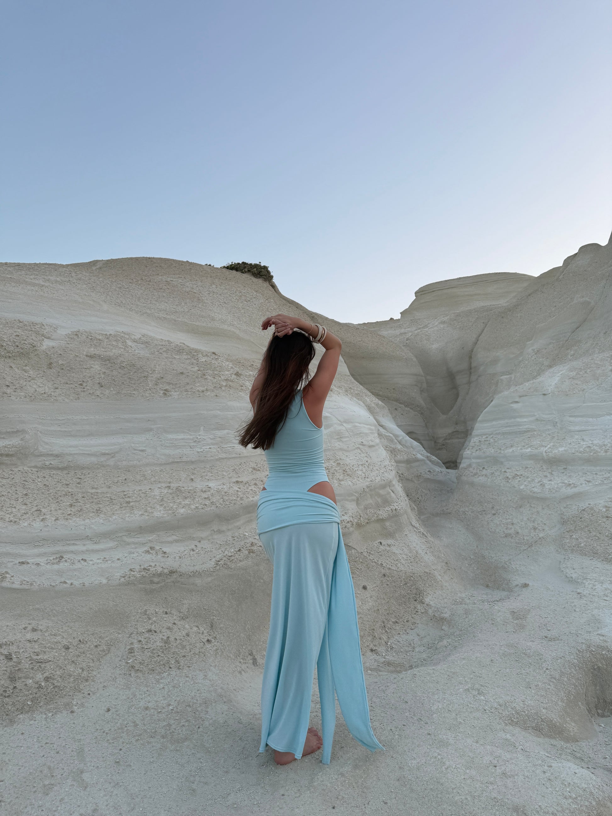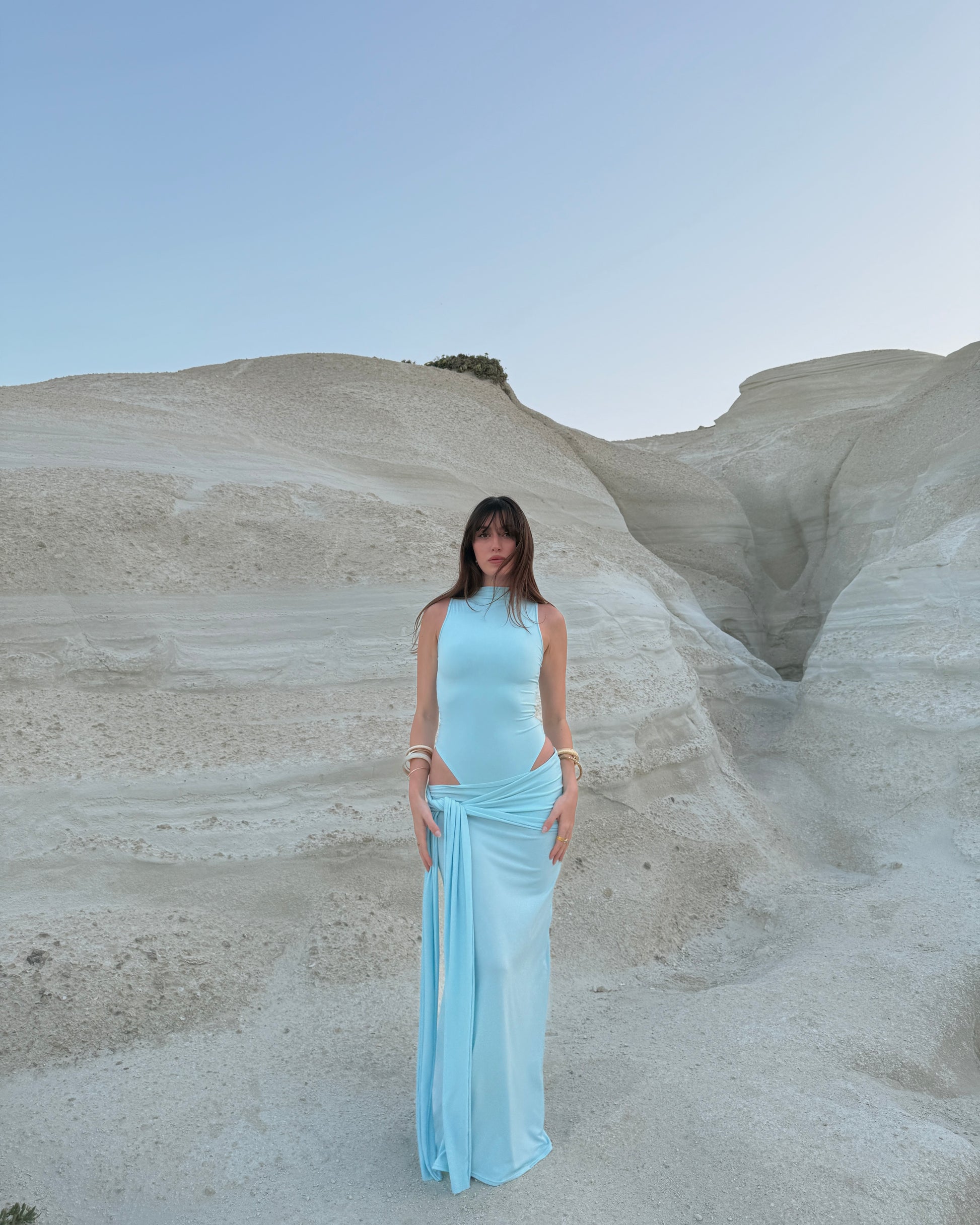 Chic, elevated, effortless. This two-piece dress features a sculpting bodysuit with a high neckline, and an asymmetric, detachable maxi skirt with a draped tie detail, creating a sleek silhouette with a bold cutout detail at the hip. The bodysuit fastens at the bottom with press studs and the skirt attaches with a hook and bar.