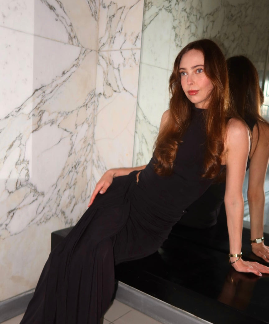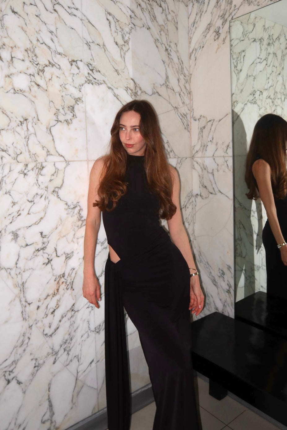 Chic, elevated, effortless. This two-piece dress features a sculpting bodysuit with a high neckline, and an asymmetric, detachable maxi skirt with a draped tie detail, creating a sleek silhouette with a bold cutout detail at the hip. The bodysuit fastens at the bottom with press studs and the skirt attaches with a hook and bar.