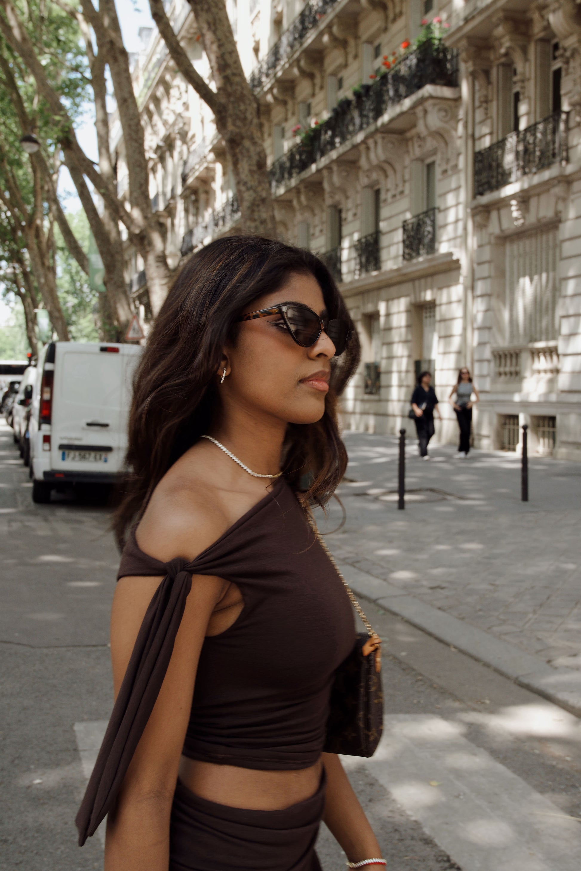 Chocolate brown set featuring a mini skirt and a one shoulder top. The top is double lined and has a tie on the one shoulder. The mini skirt features a fold over waistband that has been ruched on the sides. The waistband is elasticated.